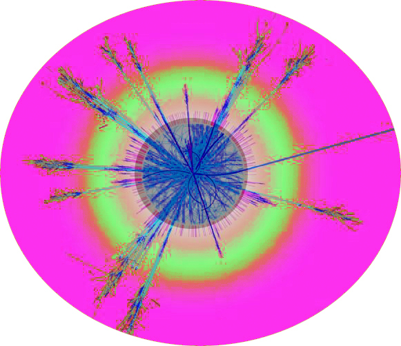 L'analyse dynamo-chromatique du résultat est saisissante. On y voit le noyau bleu éclater violement en particules centrifuges et exothermiques sous la formidable pression de l'anti-matière rose dont le spectre intérieur est irisé de vert, signe de futures réactions incontrôlables en l'état actuel de la science.