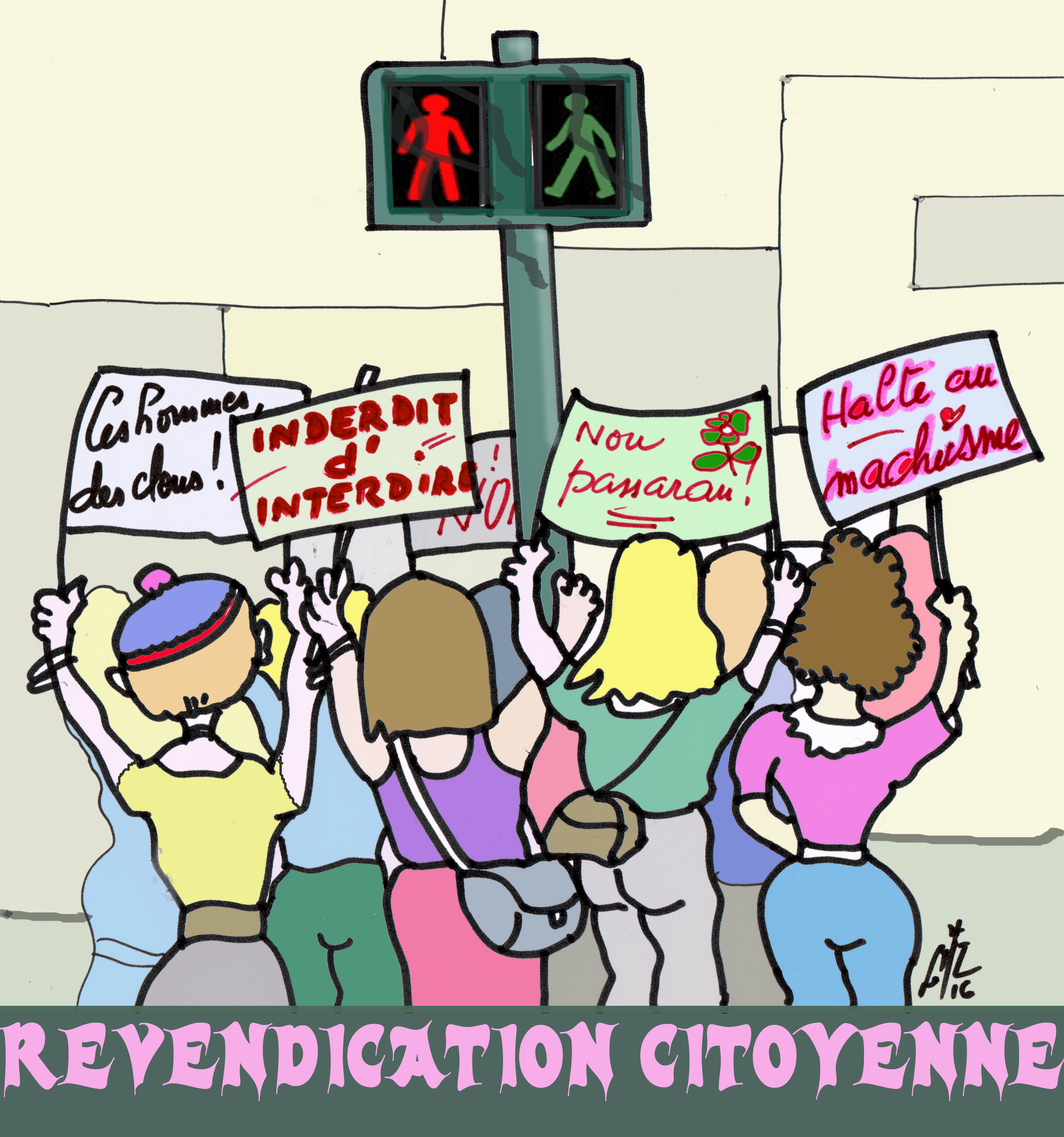 De quoi s’agit-il ? De la signalétique piéton dans les carrefours régulés par des feux tricolores. Le refus ou l’autorisation de traverser la voie, sont indiqués par deux icônes lumineuses rouge et verte , coordonnées avec les feux destinés aux conducteurs. Or il se trouve , sauf exception que je n’ai pu noter, que les personnages alertant le passant représentent manifestement des silhouettes masculines. Agile avec un pas décidé pour le bonhomme vert, raide et immobile pour son comparse qui s’interdit l’aventure traversière. Ces prescriptions binaires et autoritaires suggèrent à l’évidence , surtout aux enfants en bas âge, la primauté de l’homme pour des décisions essentielles et quotidiennes.