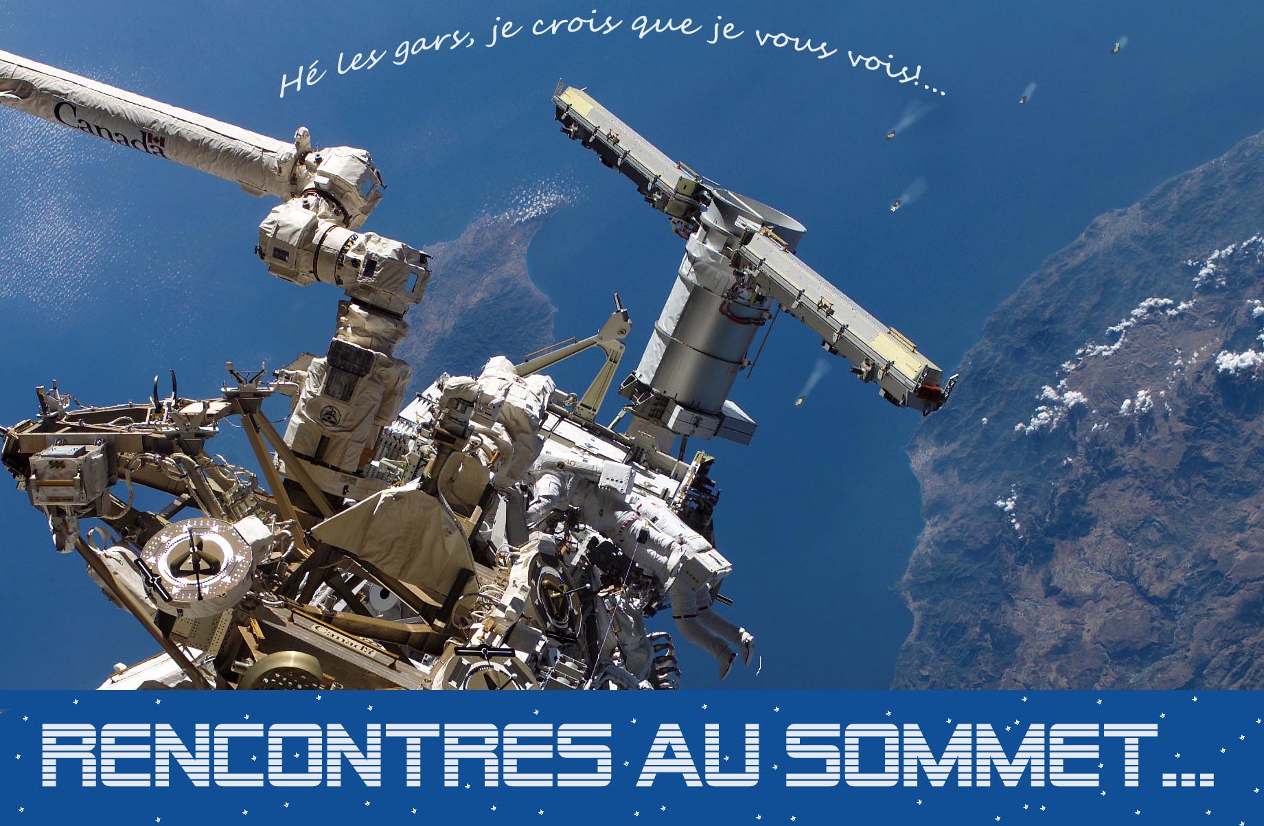 Comme récréation à ses travaux en apesanteur, il a le loisir de regarder la terre depuis 400km , belle planète bleue, et de goûter la beauté du spectacle , y compris les spectaculaires valses des cyclones, en oubliant les êtres qui la peuplent, supportent ses caprices météorologiques et l'animent, hélas, de conflits et guerres depuis les débuts de l'humanité..