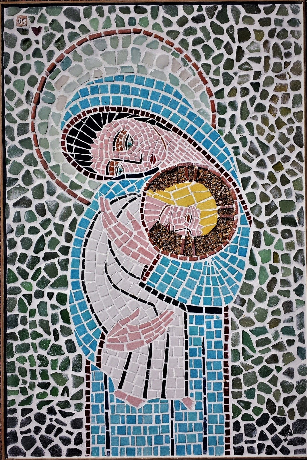 Tesson de bouteilles de vin ( jetées par dessus bord après libations de fin de bonne pêche?), morceaux de tuiles, restes d’un dépotoir sauvage , bois flottés, sculptés par les flots. Seuls éléments neufs, inclus dans ses compositions, des Émaux de Briare qui rehaussent les tons.