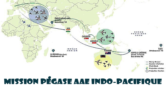 Le détachement français doit ensuite prendre part à la mission Pégase avec deux étapes en Indonésie et à Singapour. L’objectif est de mener des actions de diplomatie aérienne et de rayonnement des savoir-faire français. Elle valorise les partenariats stratégiques de la France, notamment sur le volet Rafale. Les armées présentent des moyens similaires. L’Indonésie est un partenaire de la France depuis 2011, Singapour s’est impliquée contre Daesh aux côtés des Français. Elle occupe une position clé au sein de l’Indo-Pacifique, un point d’appui pour les opérations françaises dans la zone. Au retour, une dernière étape est prévue sur la base française 104 d’Al Dhafra, aux Émirats arabes unis. Les forces françaises aux EAU sont un élément important de la stratégie française dans la zone Indo-Pacifique et, en particulier, du golfe Persique.