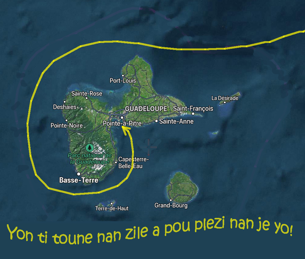 Mais que nenni! Les skippers sont obligés, par le règlement de la course, de faire le tour par le nord , leur offrant à l’occasion une découverte( pour les nouveaux) des beautés de la Guadeloupe , impression qui doit être un tantinet modérée par l‘impatience de parvenir au but !…